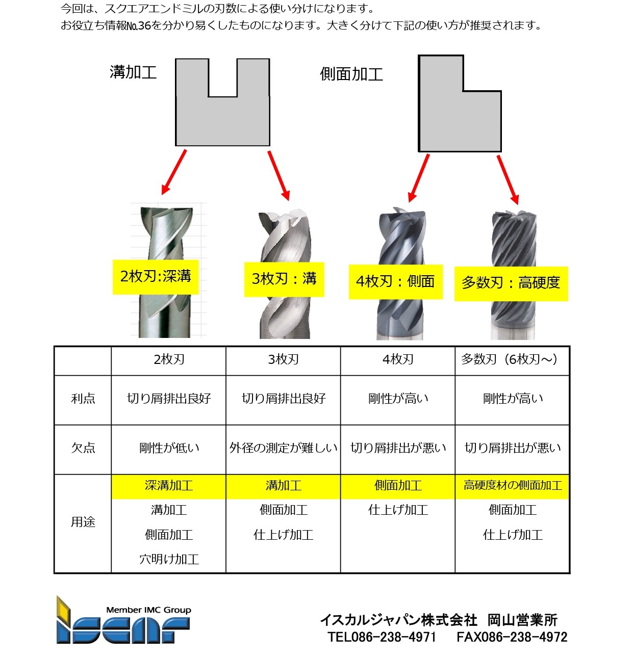 切削お役立ち情報№138です。今回はスクエアエンドミルの刃数による使い分けになります。